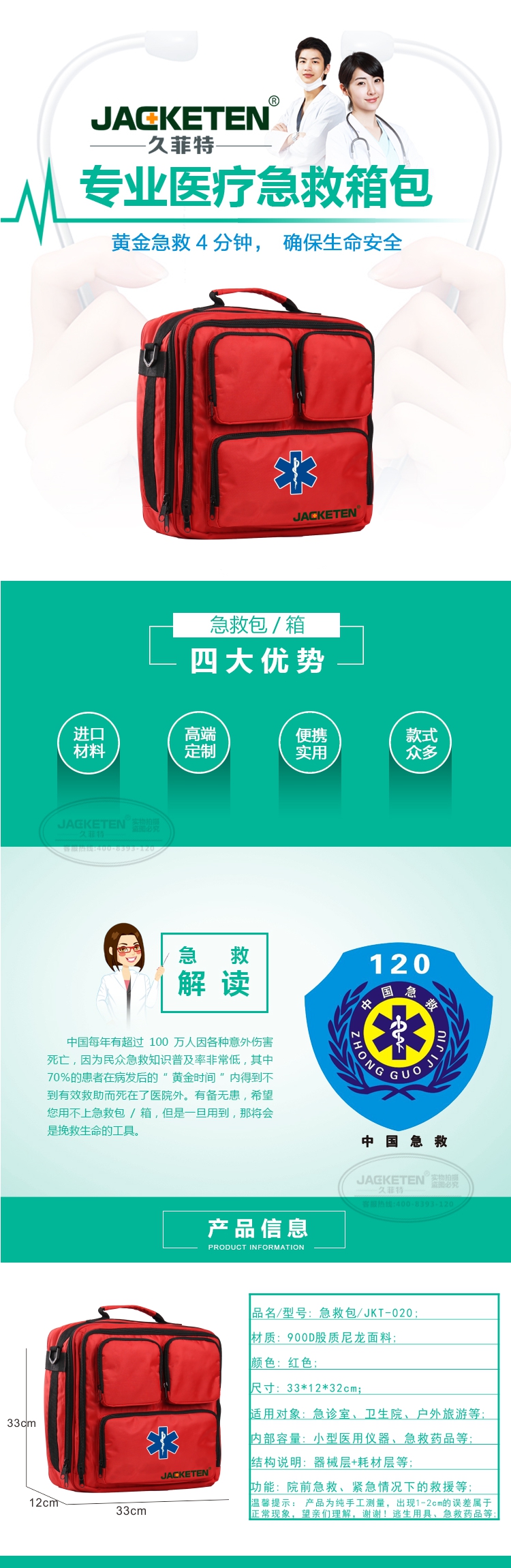 品名/貨號(hào):急救包/JKT-020;材質(zhì):900D股質(zhì)尼龍面料;顏色:紅色;尺寸:33*12*32cm;適用對(duì)象:急診室、衛(wèi)生院、戶外旅游等;內(nèi)部容量:小型醫(yī)用儀器、急救藥品等;結(jié)構(gòu)說(shuō)明:器械層+耗材層;功能:院前急救、緊急情況下的救援等